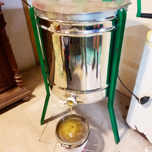 Les cadres de la hausse sont placés dans un extracteur, le miel est ensuite filtré pour le débarrasser de ses impuretés.