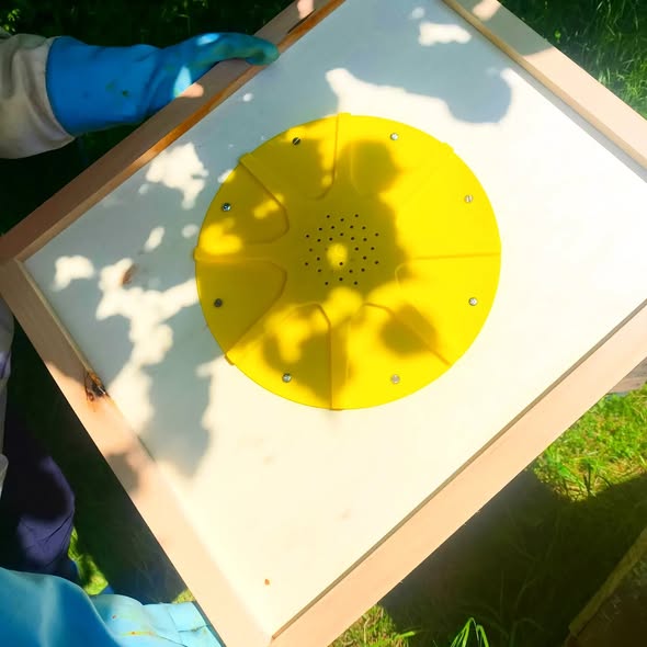 Pour cela, ce samedi 11 mai, nous avons installé une plaque sur laquelle est apposé un chasse abeilles. Cela permet aux abeilles de descendre vers la ruche, mais les empêche de remonter dans la hausse ensuite. Ainsi nous pouvons récupérer la hausse vide de toute abeille, et la transporter sans danger, laissant les abeilles bien au chaud chez elles. ![]()